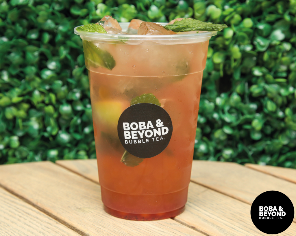Toppings include tapioca pearls, fruit popping boba, aloe vera, grass jelly, and more.